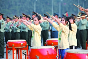 昨日下午3點開始,聯(lián)合軍樂團和合唱團、民族打擊樂團共4000余人在聯(lián)合軍樂團駐地進行了合練。記者在現場看到,廣場樂聲悠揚,氣氛熱烈。一些大學生合唱團成員從各自高校乘大巴趕至郊外,有些學生暈車剛吐完就上場加入合練。