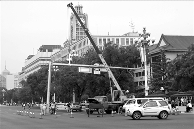 為保證來自四面八方的彩排隊伍能順利入場、退場,昨天下午,相關(guān)部門對彩排隊伍必經(jīng)路段上的橫臂式信號燈進行暫時拆除,因為此類信號燈具有指揮四面交通的功能,體積稍顯龐大,在有大規(guī)模的游行隊伍通過時,會造成不便。