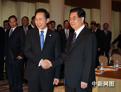 胡錦濤說,很高興與李明博在此見面。借此機會,他愿與李明博就雙邊關(guān)系和共同關(guān)心的其他問題交換意見。