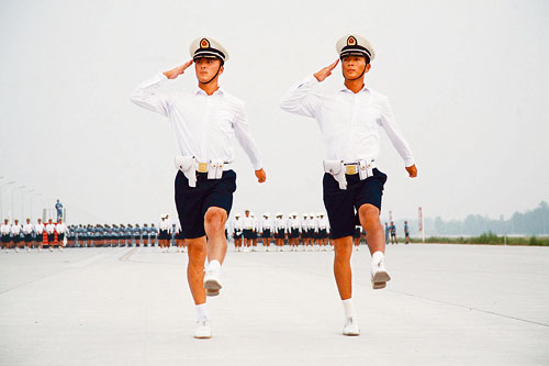 “向右看——”白色方陣的兩個(gè)領(lǐng)隊(duì)齊聲喊出口令時(shí),唰——擺頭、換臂、敬禮,剛勁飄逸的瞬間,大連艦艇學(xué)院組建的海軍學(xué)員方隊(duì)352人整齊劃一地完成了齊步換正步的動(dòng)作。潔白的海軍常服映襯著黝黑帥氣的臉,這兩個(gè)領(lǐng)隊(duì)名字叫郭海亮和馬培浩。