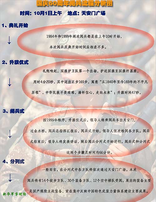 國慶慶典的時間和地點毋庸質(zhì)疑是10月1日上午10時、天安門廣場。1984年和1999年的兩次慶典都是在上午10時開始的。由此推斷,這次的程序和開始時間也不會相差太多。