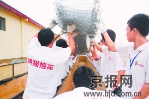在房山一間面積達(dá)1500米的煙花專用倉庫,200名熊貓煙花工作人員星夜兼程,干了近100天,將30余萬發(fā)煙花分別定位到3個巨型網(wǎng)幕上。為了防備國慶夜降雨,技術(shù)人員使用了電子加固器,給“網(wǎng)幕焰火”穿上了統(tǒng)一規(guī)格的“風(fēng)雨衣”。