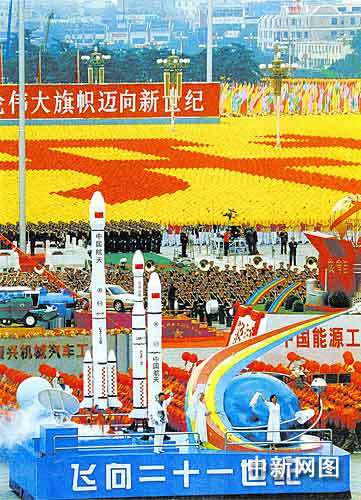 在新中國(guó)六十周年國(guó)慶大典中,中國(guó)航天科技集團(tuán)公司所屬中國(guó)運(yùn)載火箭技術(shù)研究院提供的特種車將確保閱兵武器裝備穩(wěn)妥可靠;正在軌運(yùn)行的“風(fēng)云”氣象衛(wèi)星和中國(guó)航天科技集團(tuán)公司所屬航天動(dòng)力技術(shù)研究院提供的增雨防雹火箭,將為國(guó)慶當(dāng)天氣象提供保障與服務(wù);中國(guó)航天科技集團(tuán)公司所屬中國(guó)空間技術(shù)研究院利用航天特種技術(shù)制作的六十只“中國(guó)紅”氦氣宮燈已懸浮于天安門廣場(chǎng)兩側(cè),為閱兵盛典和國(guó)慶假日營(yíng)造祥和、喜慶氣氛。