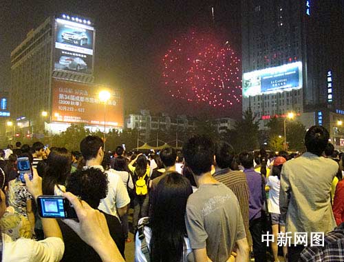 當晚8時,早已準備就緒的禮花彈在成都市區(qū)內(nèi)6個燃放點同時升空,綻放的焰火無比璀璨,給成都夜空披上了一件華麗的袍子。成都民眾紛紛走出家門,來到自家的樓頂或聚集在鬧市區(qū),共賞了這臺慶祝新中國60華誕的焰火“盛筵”。