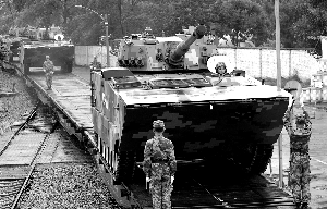 昨日上午,在通州閱兵村內(nèi),數(shù)十輛受閱裝甲車整齊停放在一起,隊(duì)員們正在擦拭車身,并用繩索固定。