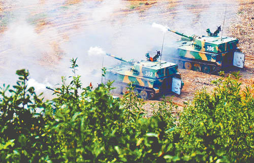 又是一連串震耳欲聾的巨響,“紅軍”前沿攻擊群開始對“藍軍”兩個高地重要目標實施精確打擊。坦克、反坦克導彈車、迫擊炮輪番開火。