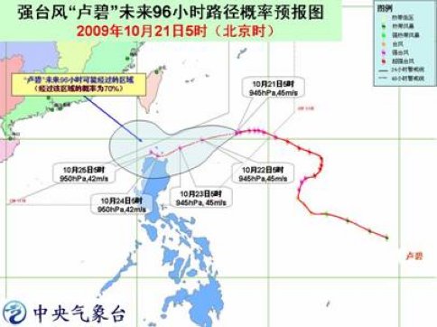 “盧碧”的中心21日5時(shí)位于菲律賓馬尼拉東北方大約940公里的西北太平洋洋面上,就是北緯20.4度、東經(jīng)127.6度,中心附近最大風(fēng)力有14級(jí)(45米/秒)。