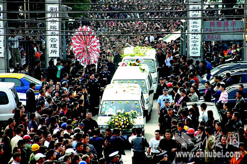 近萬名學(xué)生和社會(huì)各界群眾自發(fā)地參加追悼會(huì)。人們早早地趕到荊州市殯儀館,手捧菊花、富貴竹,胸別白花,緩緩進(jìn)入靈堂,送英雄最后一程。