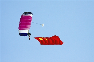 這次慶典表演,24名跳傘隊(duì)員將棄用慢速定點(diǎn)傘,首次使用造型傘。這種傘水平速度大,前進(jìn)速度達(dá)到每秒16米,對(duì)跳傘隊(duì)員心理素質(zhì)、駕馭能力和表演技巧是極大的考驗(yàn)。