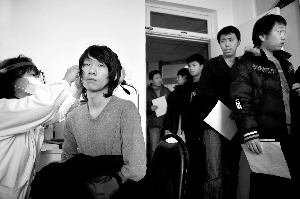體檢內(nèi)容包括內(nèi)外科中的眼、耳、聽力、身高、體重、心電圖、血尿,以及心理、毒品、艾滋病等多項(xiàng)檢查,在視力檢查室,等待檢查的應(yīng)屆學(xué)生已排起了長隊(duì),主檢醫(yī)生對應(yīng)征青年視力的各項(xiàng)指標(biāo)進(jìn)行了檢查,包括近視、斜視、色盲等內(nèi)容。主檢醫(yī)生告訴記者,每年因視力不合格的占應(yīng)征者的30%左右。