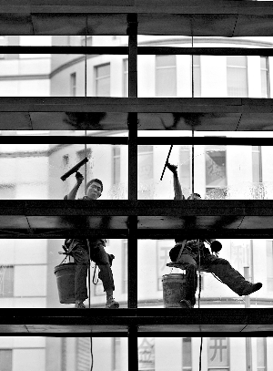 在第一家保潔公司,他認(rèn)識(shí)了“高空作業(yè)”:一根繩、一個(gè)桶,主要是和廣告牌打交道。沒(méi)有“蜘蛛人”這么時(shí)髦的叫法,那時(shí)都叫爬墻工。