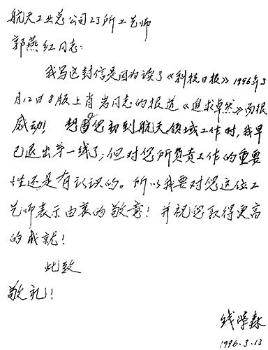 郭燕紅迫不及待地打開信。信中用藍(lán)墨水鋼筆工工整整寫道:“航天工業(yè)總公司23所工藝師郭燕紅同志:我寫這封信是因?yàn)樽x了《科技日?qǐng)?bào)》1996年3月12日8版上肖巖的報(bào)道《追求卓然》而很感動(dòng)!想您初到航天領(lǐng)域工作時(shí),我早已退出第一線了;但對(duì)您所負(fù)責(zé)工作的重要性還是有認(rèn)識(shí)的。所以我要對(duì)您這位工藝師表示由衷的敬意!并祝您取得更高的成就!錢學(xué)森”。