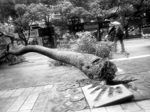 隨后,這棵樹迎風(fēng)墜地,樹根被連根拔起,發(fā)出巨大的砰響聲,周邊的地磚也被鑿裂。當(dāng)記者趕至現(xiàn)場時(shí)看到,這棵大樟樹直徑約有20公分,高約5米。