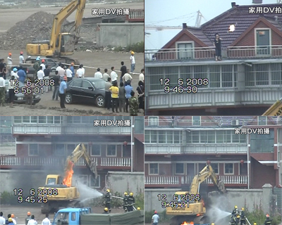九點(diǎn),潘蓉家的大門被推土機(jī)鑿開,拆遷人員進(jìn)入樓內(nèi),要把潘蓉一家清除出樓房實(shí)施拆遷,但是由于潘蓉家里一二層用于出租,三四層還有一個(gè)防盜門,所以拆遷人員到了三層以后沒法上樓,雙方隔著門開始叫喊,地面的人開始向四樓扔石塊。氣氛也變得越來越緊張。9點(diǎn)15分,挖土機(jī)開始鑿房屋的外墻,樓下的陽(yáng)臺(tái)被機(jī)器手拍斷,部分墻壁開裂并且傾斜。
