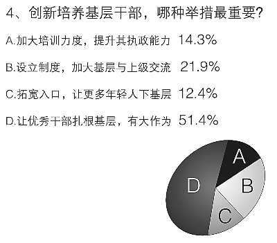 當(dāng)被問到如何創(chuàng)新基層干部培養(yǎng)方式時,51.4%的受訪者選擇了“讓優(yōu)秀干部安心扎根基層,有大作為”,這說明基層雖苦,但在基層干部眼中卻是鍛煉干部最好的大學(xué)校,另外也表明了目前基層缺人才的現(xiàn)狀,熱切呼喚德才兼?zhèn)涞摹澳苋恕比ヮI(lǐng)導(dǎo)和管理。要解決這個問題,有21.9%的受訪者認(rèn)為應(yīng)該設(shè)立制度,加大基層與上級干部間交流。同時,12.4%的黨員干部把“拓寬入口,讓更多年輕人下基層”當(dāng)作創(chuàng)新基層干部培養(yǎng)的首選。(梁昌杰、王慧)