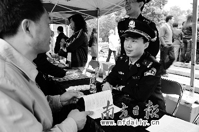 前來現(xiàn)場(chǎng)咨詢的群眾絡(luò)繹不絕。伍女士與丈夫帶著6歲的小孩一家子圍著現(xiàn)場(chǎng)的民警仔細(xì)地問。伍女士是江門臺(tái)山人,她1993年就來到廣州,在一家私人企業(yè)做工。工作了10多年,為了小孩讀書,勒緊了褲帶在越秀區(qū)文明路買了一套60多平方米的二手房,感覺自己多少有點(diǎn)像廣州人了。廣東即將推行居住證的消息讓她期待滿懷:“等了很久啊,現(xiàn)在看到了希望,有了戶口,才能真正讓自己在這里扎根下來啊!”