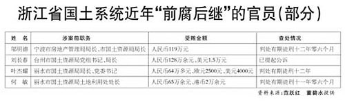 事實(shí)上,據(jù)統(tǒng)計(jì),不僅是浙江,近年來落馬的貪官不少都與房地產(chǎn)潛規(guī)則下的腐敗有關(guān),財(cái)政部原副部長(zhǎng)朱志剛,北京市原副市長(zhǎng)劉志華,山東省委原副書記、青島市委原書記杜世成,天津市政法委原副書記、天津市人民檢察院原檢察長(zhǎng)李寶金,湖南省郴州市原市委書記李大倫,安徽省原副省長(zhǎng)何閩旭,昆明市規(guī)劃局原局長(zhǎng)曾華,上海房地局原副局長(zhǎng)殷國(guó)元,江蘇省蘇州市原副市長(zhǎng)姜人杰,重慶市規(guī)劃局原局長(zhǎng)蔣勇,重慶市沙坪壩區(qū)原副區(qū)長(zhǎng)陳明,福州市國(guó)土資源局原局長(zhǎng)王炳毅,福州市倉(cāng)山區(qū)土地局原局長(zhǎng)李仲……都與房地產(chǎn)腐敗有關(guān)。