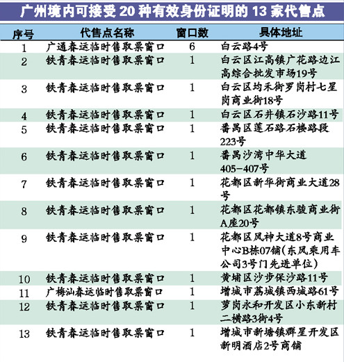 持除二代居民身份證以外的19種有效身份證件購(gòu)票,在鐵路部門(mén)設(shè)立的集中售取票點(diǎn)、車站售票窗口以及廣東境內(nèi)的79家代售點(diǎn)可以購(gòu)買實(shí)名制車票,記者了解到,其中廣州有13家這樣的代售點(diǎn),大部分分布在白云區(qū)、番禺區(qū)、花都區(qū),其他代售點(diǎn)可以辦理二代身份證購(gòu)買實(shí)名制火車票。