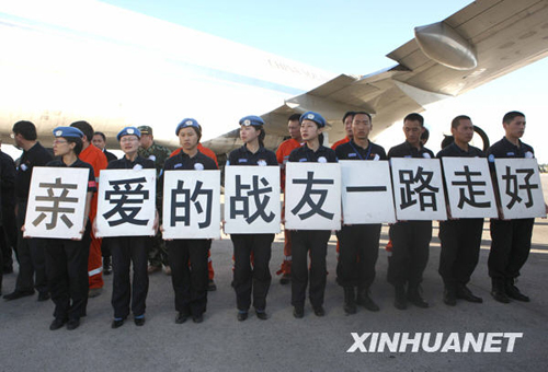 當(dāng)?shù)貢r(shí)間1月17日上午,海地太子港機(jī)場(chǎng)。在戰(zhàn)友們依依不舍的目光注視下,8名在地震中遇難的中國維和人員的靈柩被送上中國南方航空公司的一架包機(jī),啟程回國。