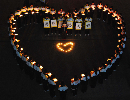 得知中國在海地地震中遇難的八名維和英雄遺體于一月十九日上午運(yùn)抵北京,江西九江市晨光中學(xué)五十余名從四川地震中走出來的綿陽籍學(xué)生倍感悲傷,晚上七點(diǎn)半左右,為表達(dá)對英烈們的緬懷之情,綿陽班開展以“為英雄哀悼,為海地祈愿“為主題的燭光祈愿活動。