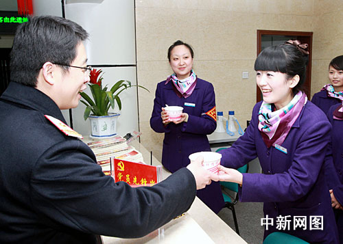 來到二樓,候車廳內(nèi)的壁掛電視正在轉(zhuǎn)播春節(jié)聯(lián)歡晚會(huì),旅客們有打著電話報(bào)平安的、有三兩成堆玩著紙牌的、絲毫感覺不到冷清。 一位青年男子正打著盹,重慶車站站長(zhǎng)李翌科輕輕拍了拍他的肩膀,“你好,小心著涼,新春快樂,請(qǐng)嘗嘗我們?yōu)槟銈儨?zhǔn)備的湯圓! 睡眼惺忪的男性旅客有點(diǎn)不知所措的接過盛滿湯圓的碗。放眼望去,他發(fā)現(xiàn)周圍的旅客都端著熱氣騰騰的湯圓有說有笑。李翌科拿著一個(gè)小巧而精致的中國(guó)結(jié),送給了他的小女兒,說“小小中國(guó)結(jié),代表鐵路職工的一片心意,祝您旅途愉快!