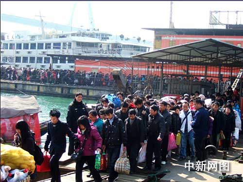 2月20日,一連寂靜數(shù)日的宜昌港口迎來(lái)節(jié)后首次農(nóng)民工出行高峰,19艘客船共10156人直接通過(guò)三峽、葛洲壩兩個(gè)船閘下行抵達(dá)了宜昌港。據(jù)宜昌港負(fù)責(zé)人介紹,當(dāng)天共有37艘普通客船、18艘高速客船出川,創(chuàng)下今年春運(yùn)以來(lái)日出川客流量最高峰。除19艘客船直接抵達(dá)了宜昌港外,還有36艘客船未過(guò)三峽船閘,直接駛?cè)肓巳龒{壩首的太平溪港和茅坪港,出川農(nóng)民工下船后再乘轉(zhuǎn)運(yùn)客車通過(guò)三峽專用公路抵達(dá)宜昌分流。