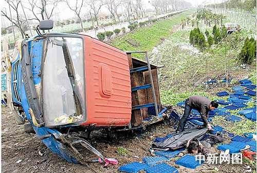 在事發(fā)現(xiàn)場,變型拖拉機已被吊車懸在田埂邊,死者趴在車旁的泥土中,周圍散落著上百只塑料筐及齒輪。距離變型拖拉機約10米遠的農(nóng)田里,停著一輛黑色鎮(zhèn)江牌照的轎車,車身有毀損。幾名交警正忙著勘查現(xiàn)場,指揮交通。