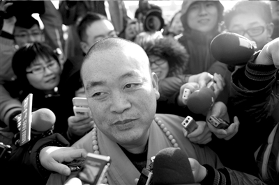 每次人大代表“走紅地毯”時(shí),圓臉?lè)蕉、身穿黃色袈裟、足蹬黑色布鞋的全國(guó)人大代表、少林寺方丈釋永信一出現(xiàn)在廣場(chǎng)上就會(huì)被記者團(tuán)團(tuán)包圍,“方丈,聽(tīng)說(shuō)你開(kāi)越野車(chē)”“方丈,你現(xiàn)在是住在大別墅了吧?”……面對(duì)大家拋出的各種問(wèn)題,他不急不惱,邊低聲念“阿彌陀佛”邊試圖向密不透風(fēng)的人墻外移動(dòng)。見(jiàn)叱咤少林寺的大師卻被眾人圍堵得步履維艱,好事者喊了句“大師,用輕功啊”!大師就是大師,面對(duì)記者們刁鉆的問(wèn)題,他往往用微笑代替回答,“我知道,就算我不說(shuō)話(huà),也會(huì)成為新聞”。