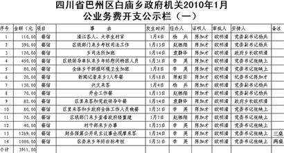 帖子內(nèi)名為《四川省巴州區(qū)白廟鄉(xiāng)政府機(jī)關(guān)2010年1月公業(yè)務(wù)費(fèi)開(kāi)支公示》的表格顯示,1月份,鄉(xiāng)政府支出公業(yè)務(wù)費(fèi)44筆,共8240.5元,其中最大的一筆開(kāi)支是,1月24日招待“財(cái)務(wù)預(yù)算公開(kāi)民主議事會(huì)觀摩來(lái)客”,請(qǐng)客三桌,花費(fèi)1269元,最小的一筆開(kāi)支僅為“購(gòu)買(mǎi)信紙”,花費(fèi)1.5元。