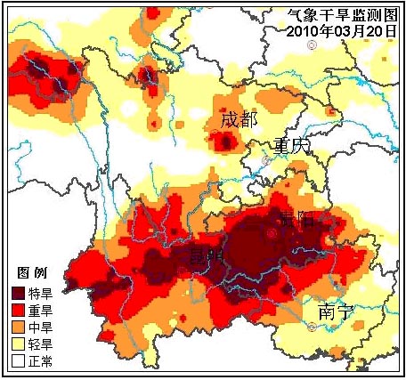 中新網(wǎng)3月21日電 綜合報(bào)道,目前,云南、廣西、貴州、四川、重慶五省區(qū)市旱情加劇。據(jù)統(tǒng)計(jì),干旱受災(zāi)人口達(dá)到5000多萬人,1600萬人飲水困難。旱情對農(nóng)業(yè)生產(chǎn)造成的影響已向上游市場傳導(dǎo)。中央氣象臺(tái)繼續(xù)發(fā)布干旱黃色預(yù)警:23日,貴州中東部有小雨或陣雨;未來三天,云南、川西高原南部、廣西西北部等旱區(qū)基本無降水,云南、貴州、川西高原南部、廣西西北部等氣象干旱區(qū)旱情將持續(xù)或發(fā)展。