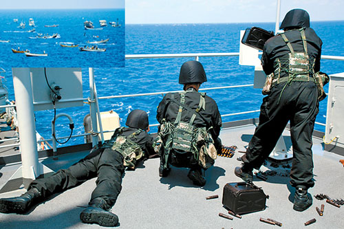 10時(shí)05分,“微山湖”艦特戰(zhàn)隊(duì)員和反海盜分隊(duì)按部署就位。指揮員下令發(fā)射信號(hào)彈進(jìn)行警告,但數(shù)艘可疑快艇繼續(xù)向編隊(duì)靠近。10時(shí)39分,沖在最前面的幾艘快艇已接近至“微山湖”艦左舷5鏈(925米)處。指揮員果斷下令,使用重機(jī)槍進(jìn)行警告攔阻射擊(見(jiàn)上圖,左上角為可疑快艇)!班睒屄曧懫穑梢煽焱V沽饲斑M(jìn),不久便調(diào)頭離去。“微山湖”艦重新調(diào)整航向,于當(dāng)?shù)貢r(shí)間3月21日凌晨將“振華9號(hào)”護(hù)送至安全海域。