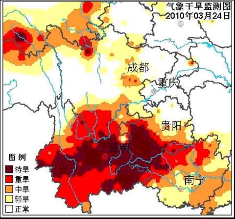 3月24日氣象干旱監(jiān)測顯示,云南大部、貴州西部和南部、廣西西部和北部、四川南部等地存在中度以上氣象干旱,其中云南除西北部和東北部的其它大部地區(qū)、貴州西南部、廣西西北部等地存在重度以上氣象干旱。