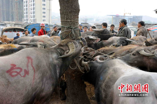 近中午時(shí)間,市場(chǎng)里買賣的人群還未散去。秦大章夫婦牽著剛買的牛回家了,這得花上2、3個(gè)小時(shí)的時(shí)間;氐郊,喂牛的水又是一個(gè)問題,“沒干凈水夠它喝,只能像鄰居那樣把洗菜、洗臉腳的水留下給牛喝。”秦大章的妻子說。雖然羨慕村里有人可以用機(jī)器耕地,但家里的4、5畝地多在石頭叢生的半山腰上,秦家夫婦還是只能選擇最傳統(tǒng)的牛耕方式。