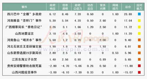 應(yīng)對有待進(jìn)一步加強(qiáng)(黃色區(qū)域):河南睢縣“茶杯門”事件、廣西煙草局長香艷日記、山西地震謠言;
