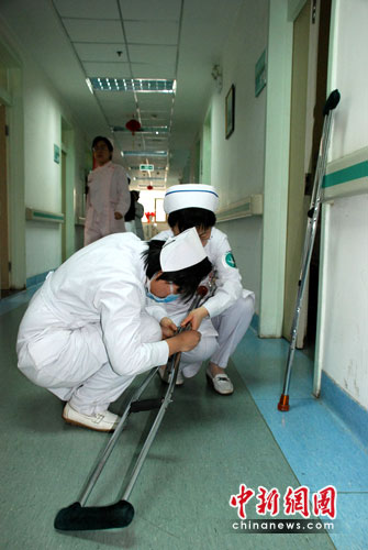 中新網(wǎng)4月12日電( 楊麗紅)近日,在山醫(yī)大一院綜合科病區(qū)接受治療的王家?guī)X獲救工友經(jīng)下肢靜脈B超檢查以及凝血時間生化等檢查后,各項指標顯示無異常,可以由護士陪同,慢慢下地活動了。這是為了預(yù)防長期臥床的傷員發(fā)生下肢靜脈血栓。