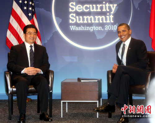 中新社華盛頓4月12日電 (記者 張朔 吳慶才)中國國家主席胡錦濤當?shù)貢r間12日下午在華盛頓會見美國總統(tǒng)奧巴馬。