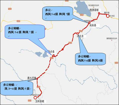 青海省氣象局預(yù)計(jì),今天白天到夜間,青海全省各地多云或晴,其中海南、果洛北部有6到7級(jí)西風(fēng),海南的部分地區(qū)有沙塵天氣。沿途天氣對(duì)前往玉樹(shù)震區(qū)救災(zāi)車輛會(huì)有一定影響,請(qǐng)前往災(zāi)區(qū)的救援人員注意防范。
