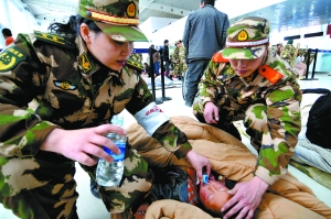 只要有傷員,羅愛(ài)華和戰(zhàn)友就用肩扛、用手抬,將傷者抬進(jìn)大廳輸液、包扎……等待專(zhuān)機(jī)到來(lái)。13時(shí)50分,一名重傷女孩被醫(yī)療隊(duì)從車(chē)上接到候機(jī)大廳。羅愛(ài)華看到女孩因缺水嘴唇干裂、臉發(fā)青。她立即拿來(lái)礦泉水,一口一口喂到女孩嘴里?赡苁翘L(zhǎng)時(shí)間沒(méi)喝水,女孩一口氣連喝十幾口。喝了近半瓶水后,女孩臉色開(kāi)始好轉(zhuǎn),并用感激的眼神打量這位阿姨。這時(shí),接傷員的專(zhuān)機(jī)到達(dá),女孩被抬上飛機(jī)。