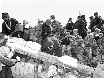 4月15日清晨,青海省軍區(qū)某獨(dú)立步兵團(tuán)官兵在玉樹縣結(jié)古鎮(zhèn)扎西達(dá)通街道搶救被掩埋的群眾時(shí),玉樹縣民族職業(yè)學(xué)院的雅瑪才讓老師向官兵們大聲呼喊:“快來救人!”