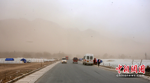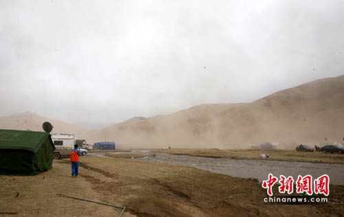 地震發(fā)生后,玉樹惡劣天氣頻頻出現(xiàn),幾乎天天都要出現(xiàn)沙塵暴。記者來(lái)到災(zāi)區(qū)后,第一感覺(jué)就是這里風(fēng)沙大,一天要刮幾次大風(fēng)。風(fēng)沙吹在的人眼睛都睜不開,災(zāi)民安置區(qū)內(nèi)天昏地暗,居住的帳篷內(nèi)床上,吃飯的碗,臉盆里,電腦上都是灰塵。