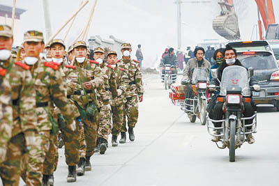 在玉樹(shù),人們正在為不可知的明天儲(chǔ)備一切能得到的東西,包括從廢墟下翻出的一塊還算完整的布料,以及每一個(gè)過(guò)路人手里的蘋(píng)果或藥品。想要找到一個(gè)開(kāi)張的鋪?zhàn)訉?shí)在不容易。沒(méi)有倒掉的店鋪緊閉大門(mén)。出租車(chē)很少愿意停下來(lái)搭客。因?yàn)槿吮纫郧吧倭撕芏啵瑹o(wú)家可歸的狗開(kāi)始明目張膽地四處亂竄,對(duì)著行人吼叫。