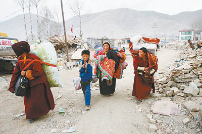 青海師范大學(xué)3年級(jí)學(xué)生伊西措毛是在15日凌晨?jī)牲c(diǎn)趕回玉樹(shù)的,但夜色并不能完全向她掩蓋地震造成的創(chuàng)傷。她路過(guò)結(jié)古鎮(zhèn)口塌掉的瑪尼堆,這是全世界最大的一個(gè),曾讓玉樹(shù)人引以為傲;她路過(guò)勝利路和民主路交界的三叉路口,原先最繁華的商業(yè)中心已經(jīng)被夷為平地;最后,她來(lái)到自己的家門(mén)口,這里保存著她從4歲開(kāi)始的所有夢(mèng)想。