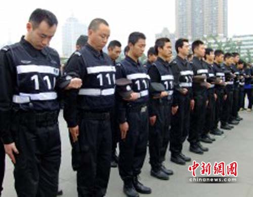 今晨,成都的上空被陰云籠罩,陰沉沉灰蒙蒙的天空使整座城市都沉浸在哀悼的氛圍當中。上午10點許,成都市公安局青羊分局巡警大隊二十余名干警邁著整齊的步伐來到天府廣場,面對降下的半旗,向在這次地震中遇難的藏族同胞們默哀三分鐘。不少市民紛紛前往向遇難同胞默哀。
