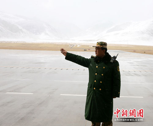 中新網(wǎng)青海玉樹4月22日電(石磊記者劉忠俊)22日5:10分,青海玉樹災(zāi)區(qū)陰云密布,天空下起大雪。為確保唯一空中生命線的暢通,武警青海總隊駐巴塘機場官兵加強機場安全保衛(wèi)工作。