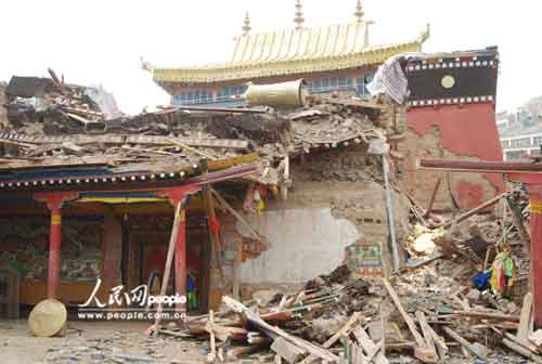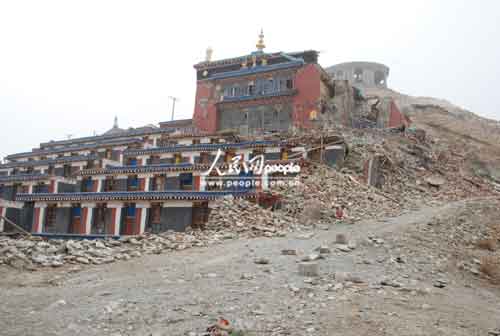 距結(jié)古鎮(zhèn)約20公里的禪古寺是該地區(qū)噶舉派最大的寺院,也是地震中損毀最嚴(yán)重的寺廟,3個主殿堂損毀兩座,經(jīng)堂全部倒塌,有260間僧房與兩個閉關(guān)等也被全部毀壞,更重要的是還有大量佛教用品和珍貴文物埋在廢墟下。