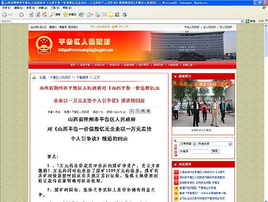 針對媒體報道的“一萬元轉(zhuǎn)讓價款”,文章介紹稱,結(jié)合平魯區(qū)的實際情況,該地煤礦企業(yè)的產(chǎn)權(quán)轉(zhuǎn)讓實際上由三部分組成:一是實物資產(chǎn),二是土地使用權(quán),三是采礦權(quán)。