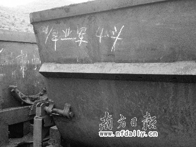 記者昨日在現(xiàn)場(chǎng)看到,礦井出口處擺著9名死難礦工的遺體,遺體旁是一排車(chē)斗,一個(gè)車(chē)斗上還有工頭用白色粉筆記錄下的死者李業(yè)軍5月26號(hào)的產(chǎn)量———早班4斗。