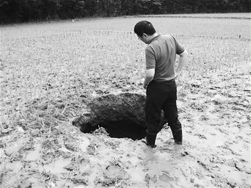 3天后,崇州市懷遠(yuǎn)鎮(zhèn)村民周先生也發(fā)現(xiàn)了一個(gè)“天坑”。周先生說(shuō),他路過(guò)鄰居家一塊秧田時(shí),秧田里突然噴水,勢(shì)如泉涌。水停后,原本好好的秧田竟出現(xiàn)一個(gè)1米多深的“天坑”。