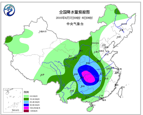 6月7日,新疆大部、西藏中部、甘肅西部、青海西部、內(nèi)蒙古大部、黑龍江大部、吉林、遼寧、河北大部、山西北部、北京、天津、山東、江蘇、上海、浙江、江西、安徽東部、福建、廣東大部為多云到晴天氣;云南西部、廣西、海南有陣性降雨;大部分地區(qū)日最高氣溫在28~33℃之間。我國其余大部分地區(qū)有小到中雨,其中甘肅中東部、陜西、四川東部、重慶、貴州大部、湖北、湖南、河南西南部等地的部分地區(qū)有大雨,部分地區(qū)有暴雨,局地有大暴雨,并伴有短時雷雨大風(fēng)(圖1),日最高氣溫一般在22~28℃之間,天氣較為涼爽。
