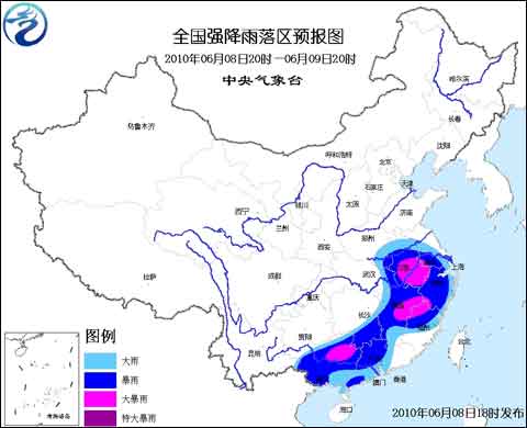 預(yù)計(jì),6月8日20時(shí)到6月9日20時(shí),河南南部、湖北東部、安徽、江蘇西部、湖南南部、江西、浙江、福建中北部、廣西、廣東中西部的部分地區(qū)有大到暴雨,其中,安徽南部、江西東北部、福建北部、廣西東北部等地的局部地區(qū)有大暴雨;上述部分地區(qū)還將伴有短時(shí)雷雨大風(fēng)等強(qiáng)對(duì)流天氣。